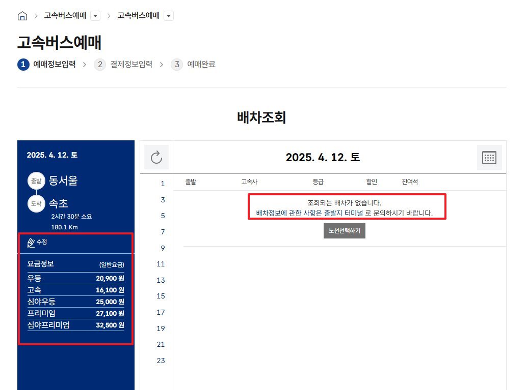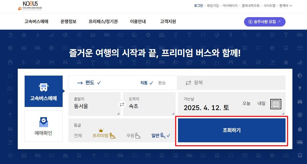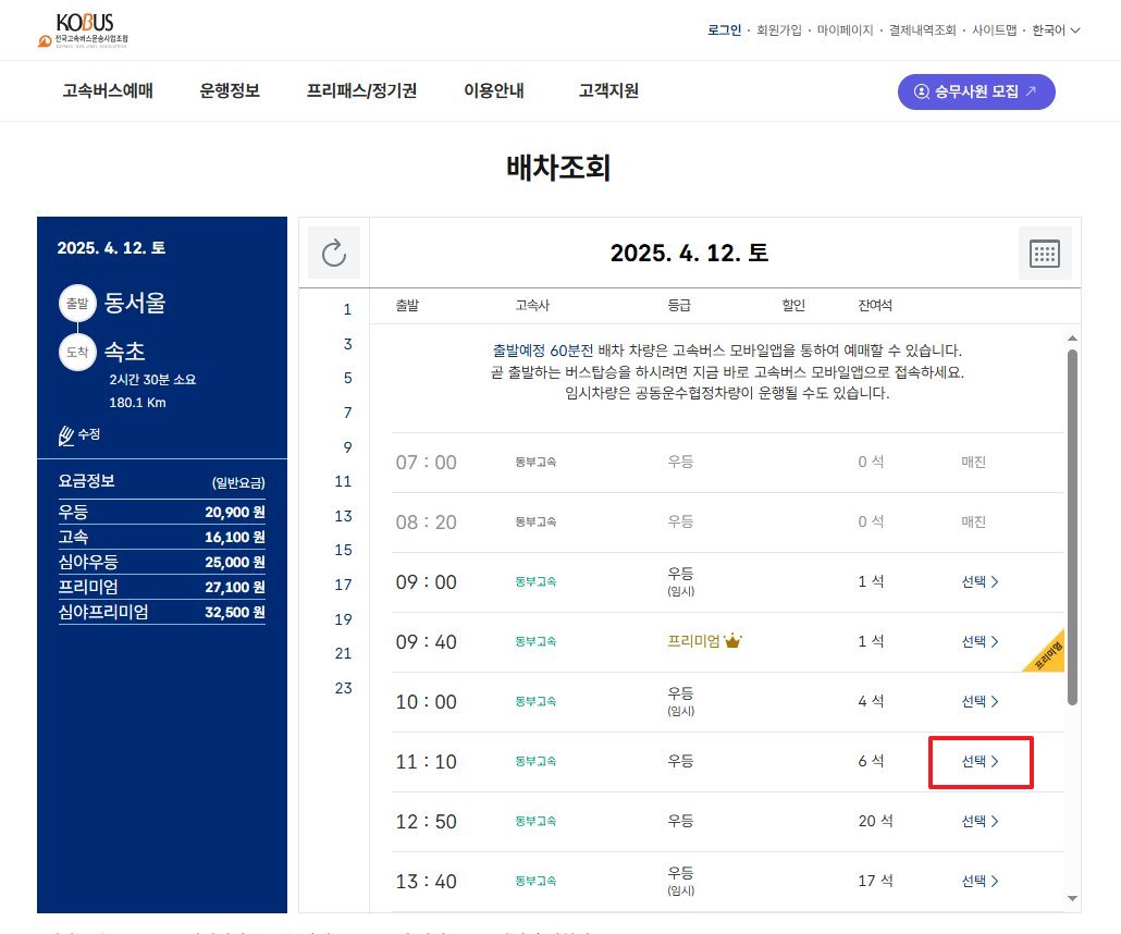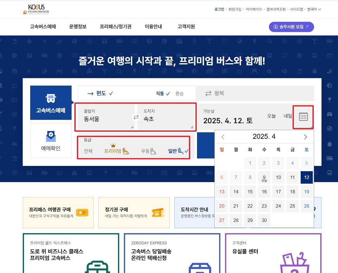 - 프리미엄 고속버스, 우등, 일반 선택 가능