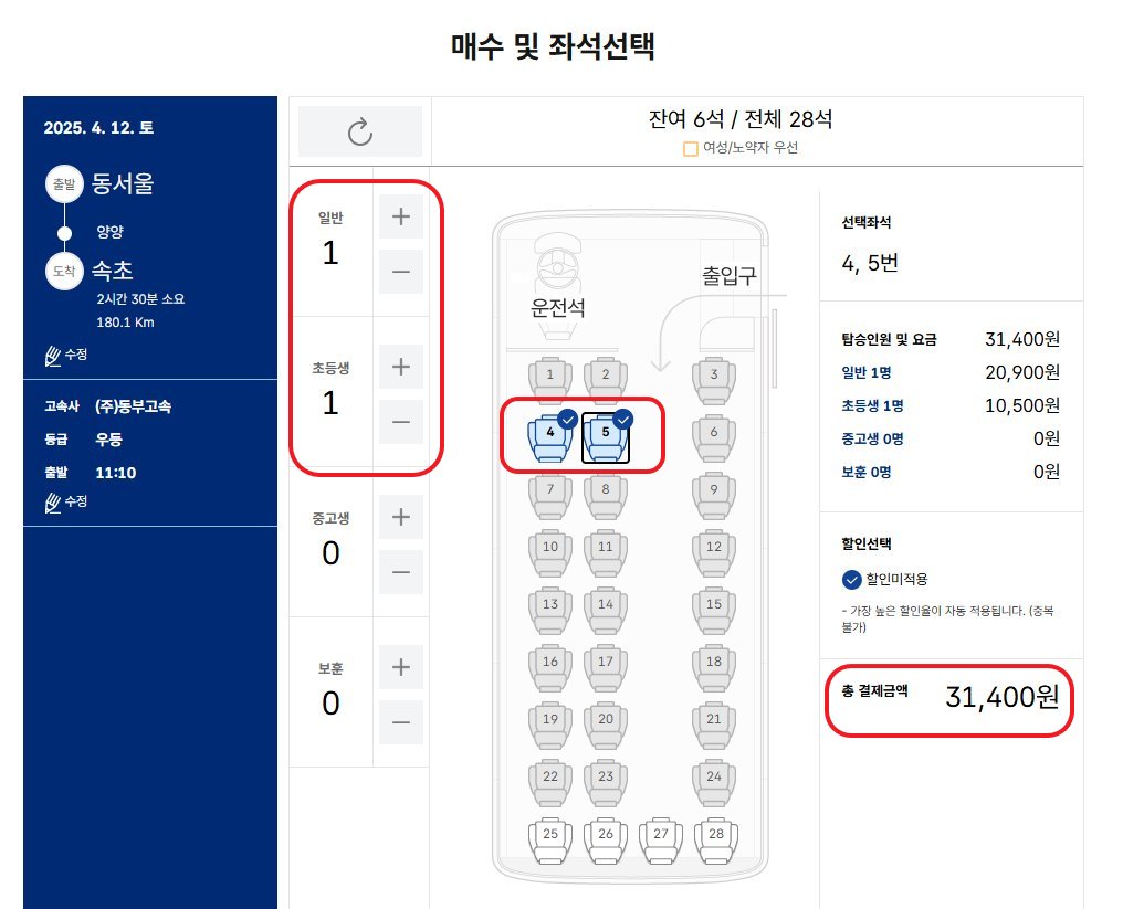 - 고속버스 예매 시 좌석 선택 단계에서 ‘권종’ 표시를 통해 확인 가능