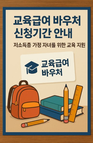 교육급여 바우처 신청자격이 된다면 절대 놓치지 마세요. 지금 복지로 또는 주민센터에서 신청 가능 여부를 꼭 확인해보시기 바랍니다! 궁금하신 내용이나 신청 절차에 대해 더 자세한 안내가 필요하신가요? 교육급여 바우처는 학생들의 학업 부담을 줄이고 더 나은 교육 환경을 제공하는 데 큰 도움을 줍니다. 해당 조건에 맞는 가정이라면 꼭 신청하시기 바랍니다. 2025년 교육급여 바우처를 적극 활용하여 학생들의 학습 환경을 개선하고 교육 기회를 넓히세요~