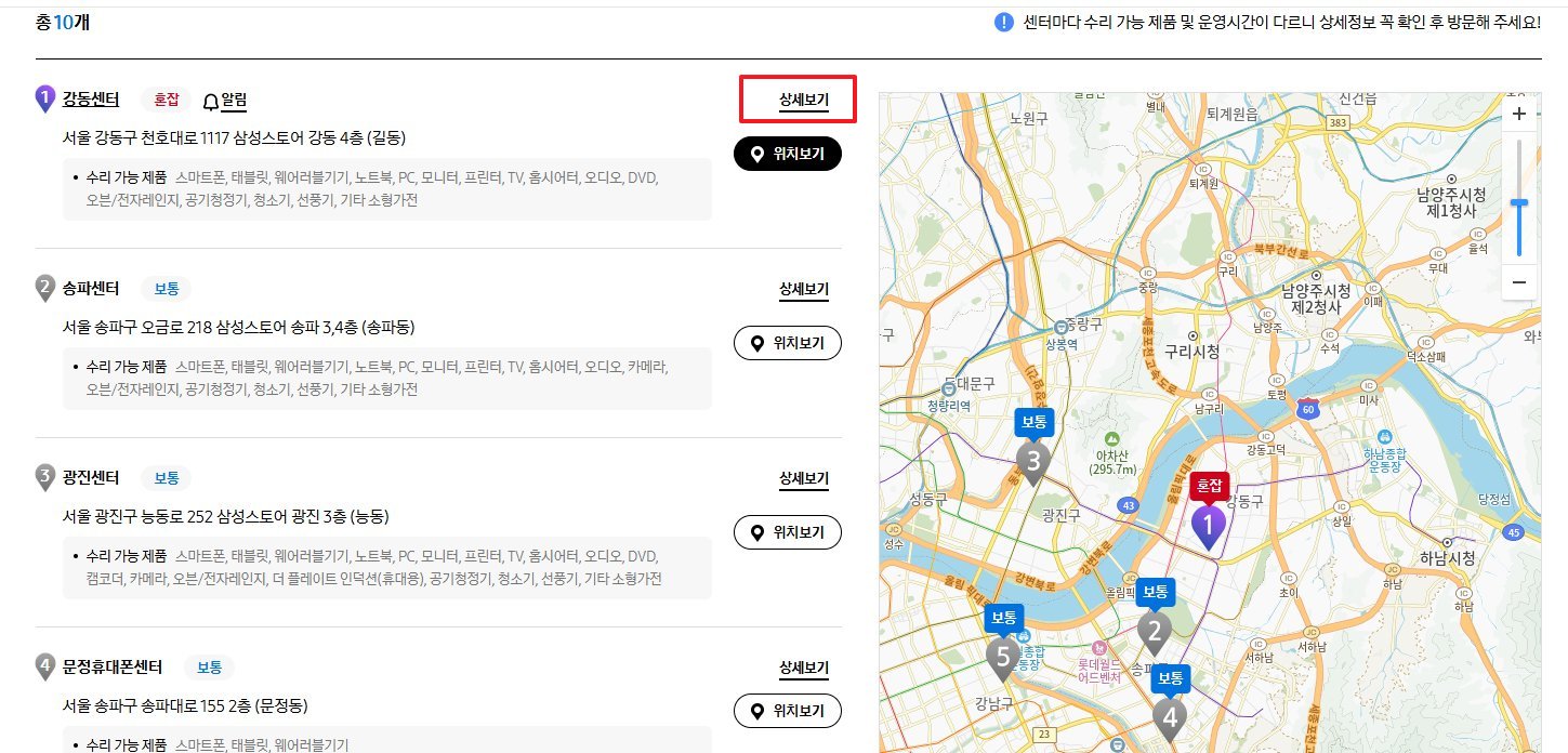 * 일부 센터는 특정 품목만 취급하므로 사전에 전화로 확인하는 것이 좋습니다.