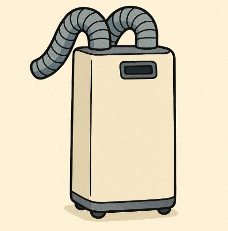 이동식 에어컨은 실외기가 따로 없는 구조라, 압축기와 송풍기가 모두 본체에 들어 있습니다.