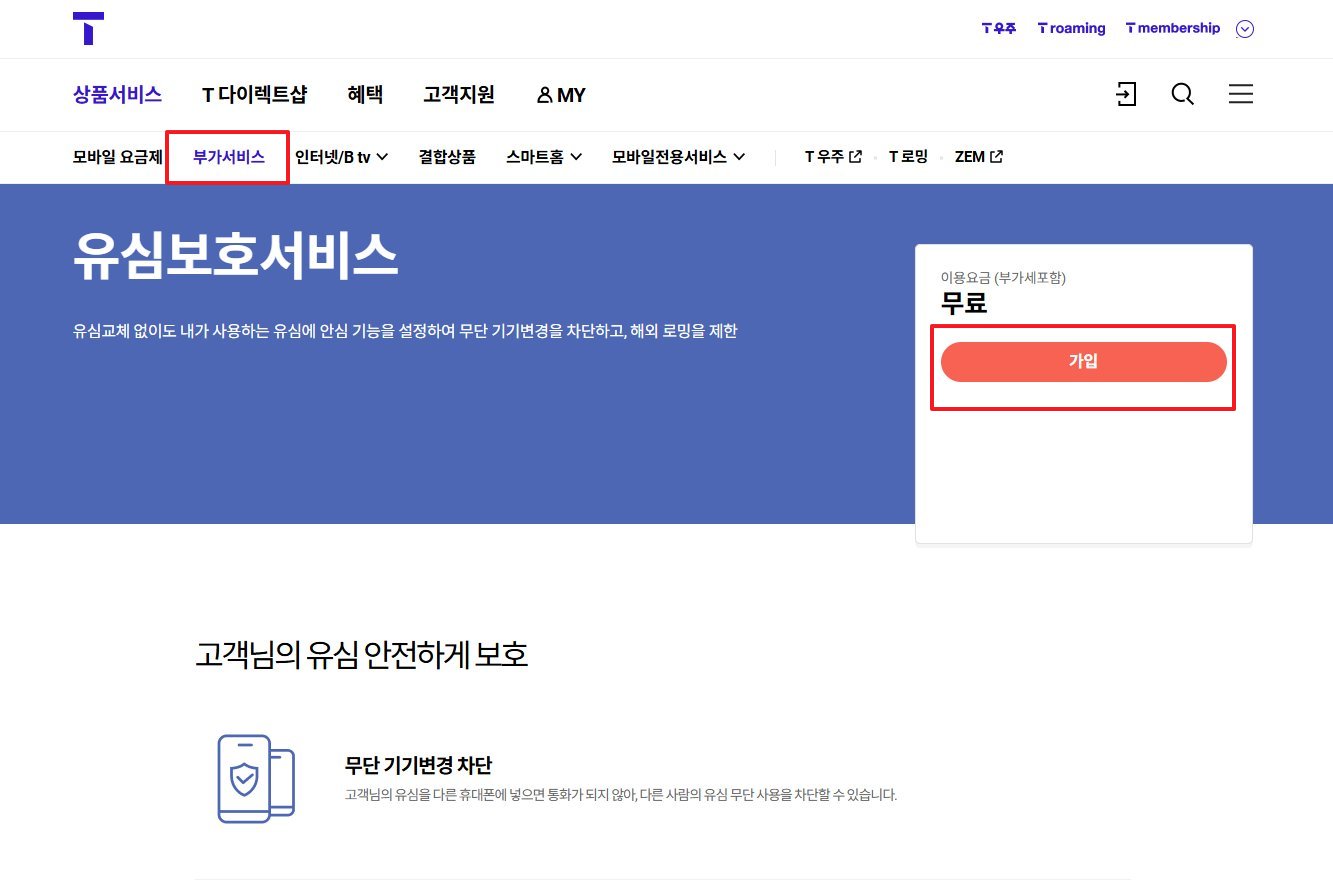 - 로그인 후 [부가서비스] → [조건설정] → [안심/보험] → [유심보호서비스] 메뉴로 이동해 가입합니다.